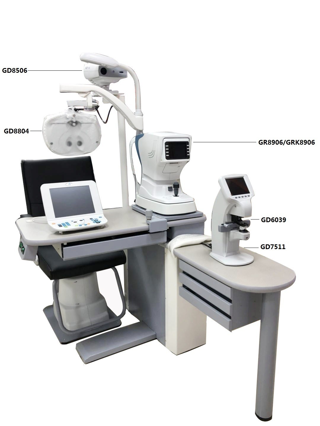 1. ออปทัลโมมิคยูนิต -GD7511: แขนโฟโรพเตอร์สามารถขึ้นลง หมุนปรับได้ มีโต๊ะเพิ่มเติมสำหรับวางเครื่องวัดเลนส์